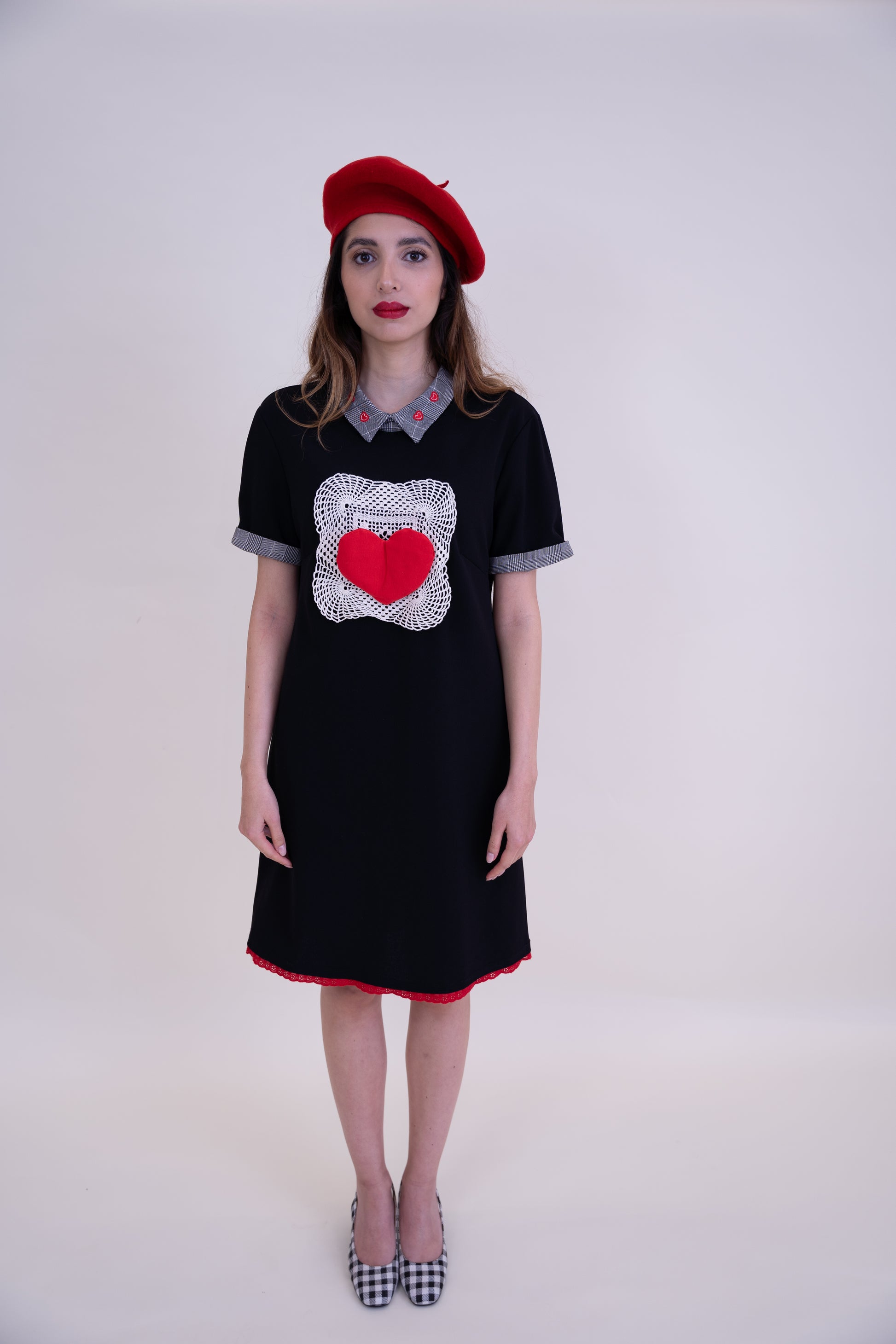 We started with a classic black dress, just below the knee, and gave it a romantic, Parisian-inspired makeover. We added a bold red trim at the hem for a striking contrast and a pop of color. We carefully placed a delicate doily with a puffed heart at the chest, making it a true statement piece. To enhance the charm, we added small heart-shaped patchwork details near the neckline, giving the dress a unique and playful touch. We turned a simple silhouette into an elegant, one-of-a-kind creation that blends classic style with modern sweetness.