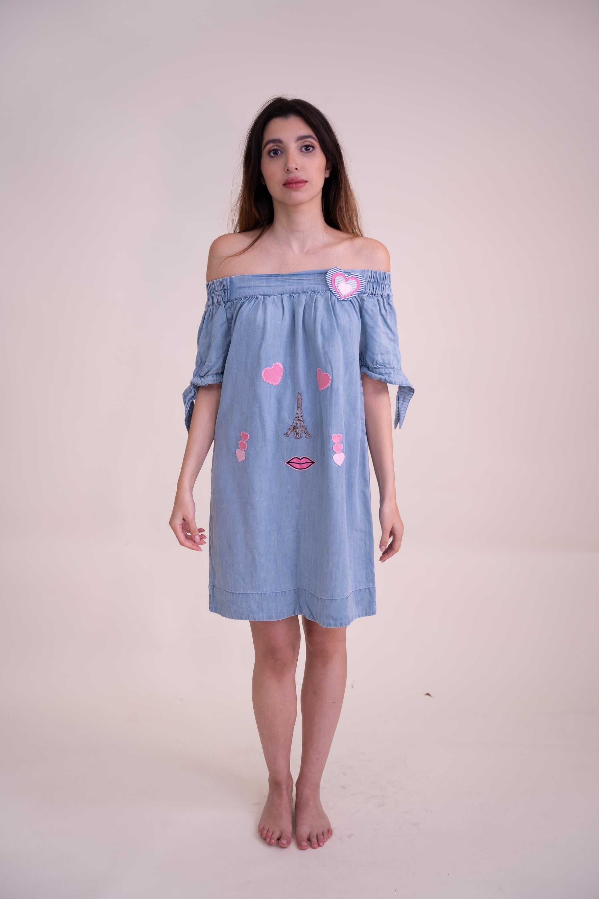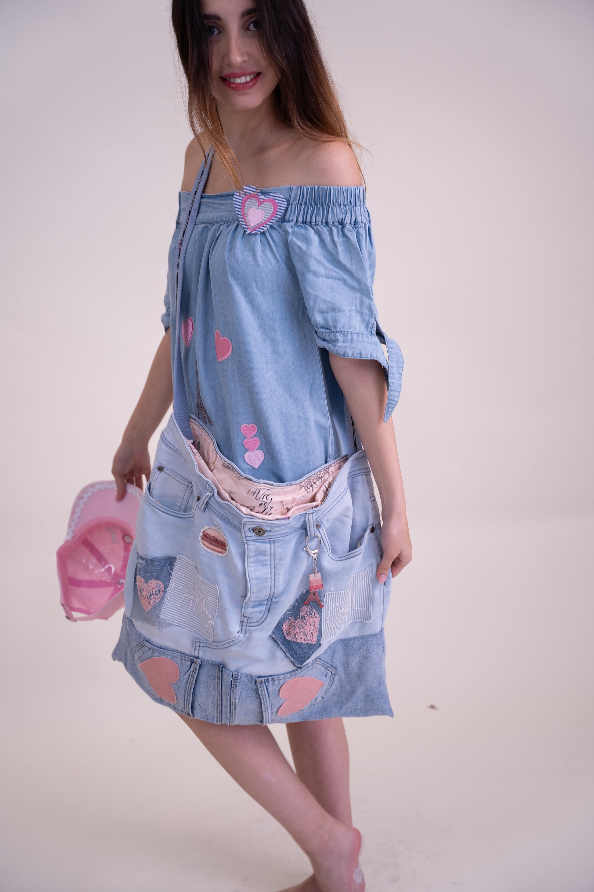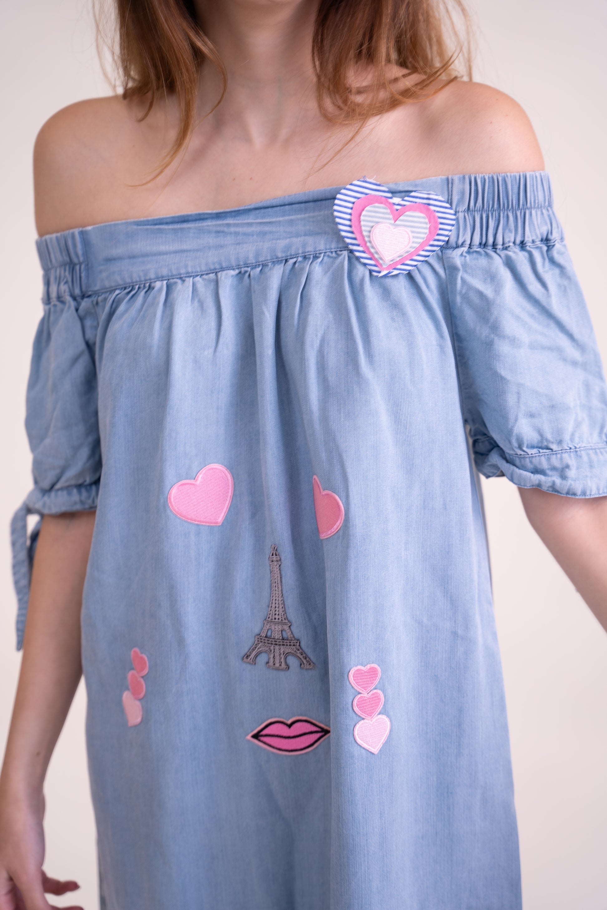 We took a lightweight sky blue off-shoulder dress and transformed it into a one-of-a-kind, upcycled masterpiece. This unique piece features playful embroidered appliqués, creating a whimsical face using Paris-inspired elements—a delicate Eiffel Tower as the nose, pink hearts as expressive eyes, and charming lips for a romantic touch.