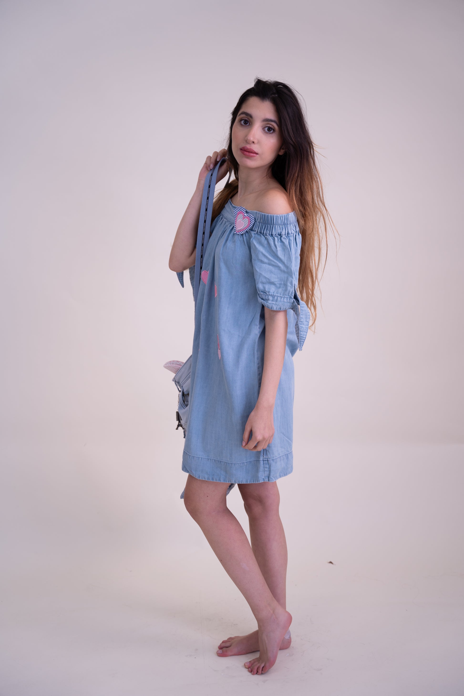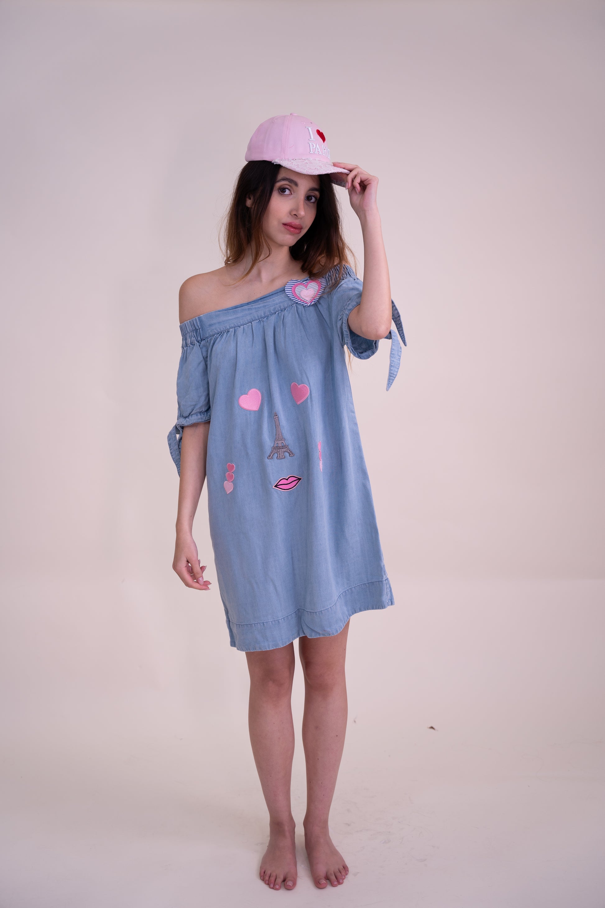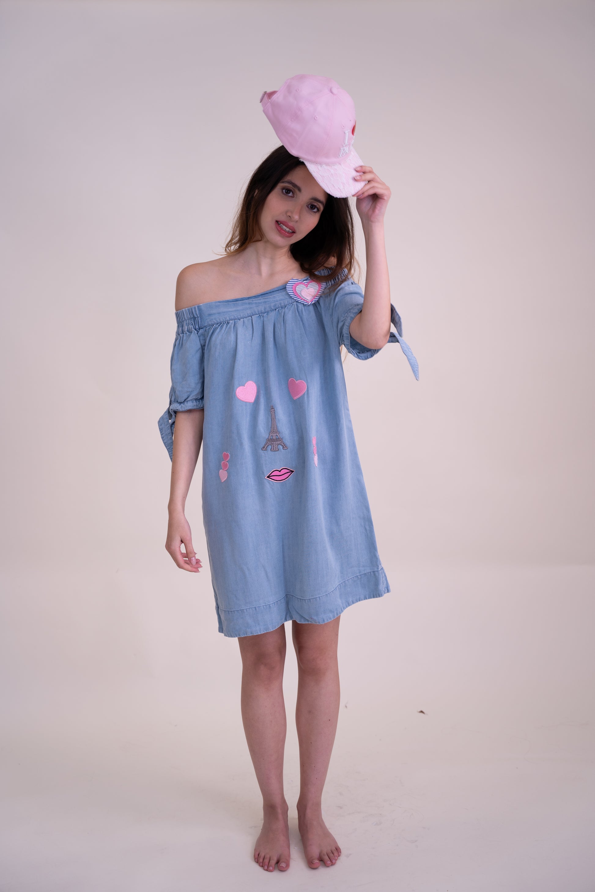 We took a lightweight sky blue off-shoulder dress and transformed it into a one-of-a-kind, upcycled masterpiece. This unique piece features playful embroidered appliqués, creating a whimsical face using Paris-inspired elements—a delicate Eiffel Tower as the nose, pink hearts as expressive eyes, and charming lips for a romantic touch.
